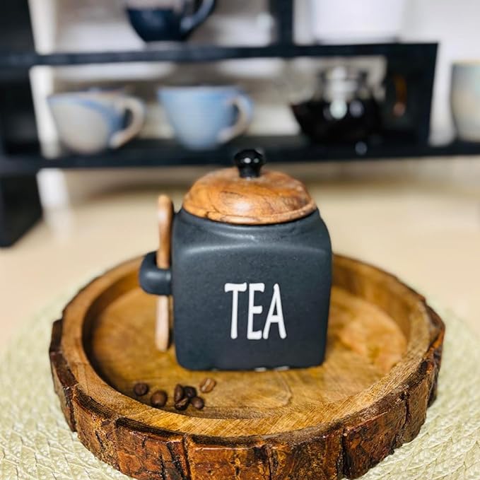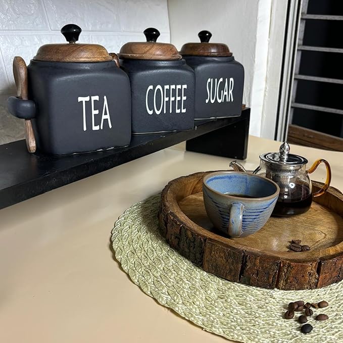 Morwee Black Ceramic Tea Coffee Sugar Jar Set β Wooden Lid, Spoon & Airtight Finish | Kitchen Decor Storage Set of 3